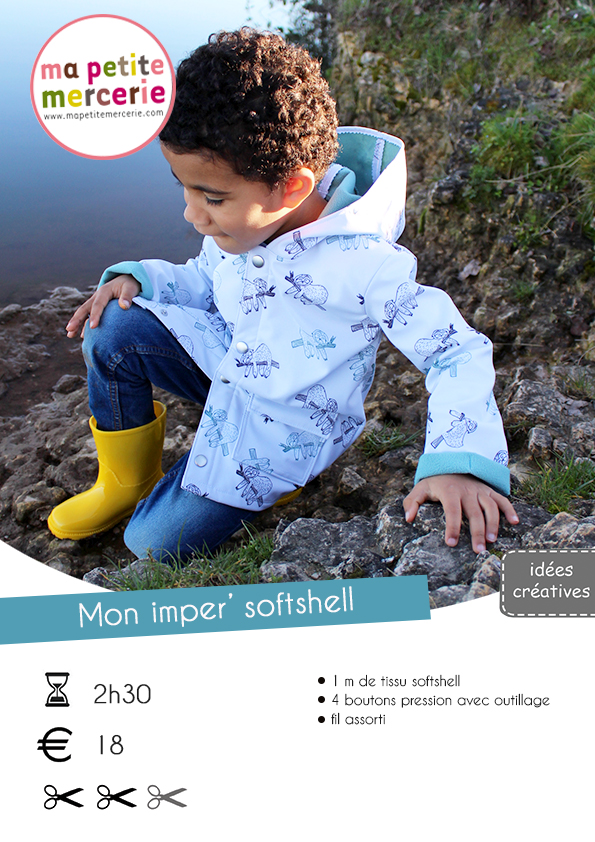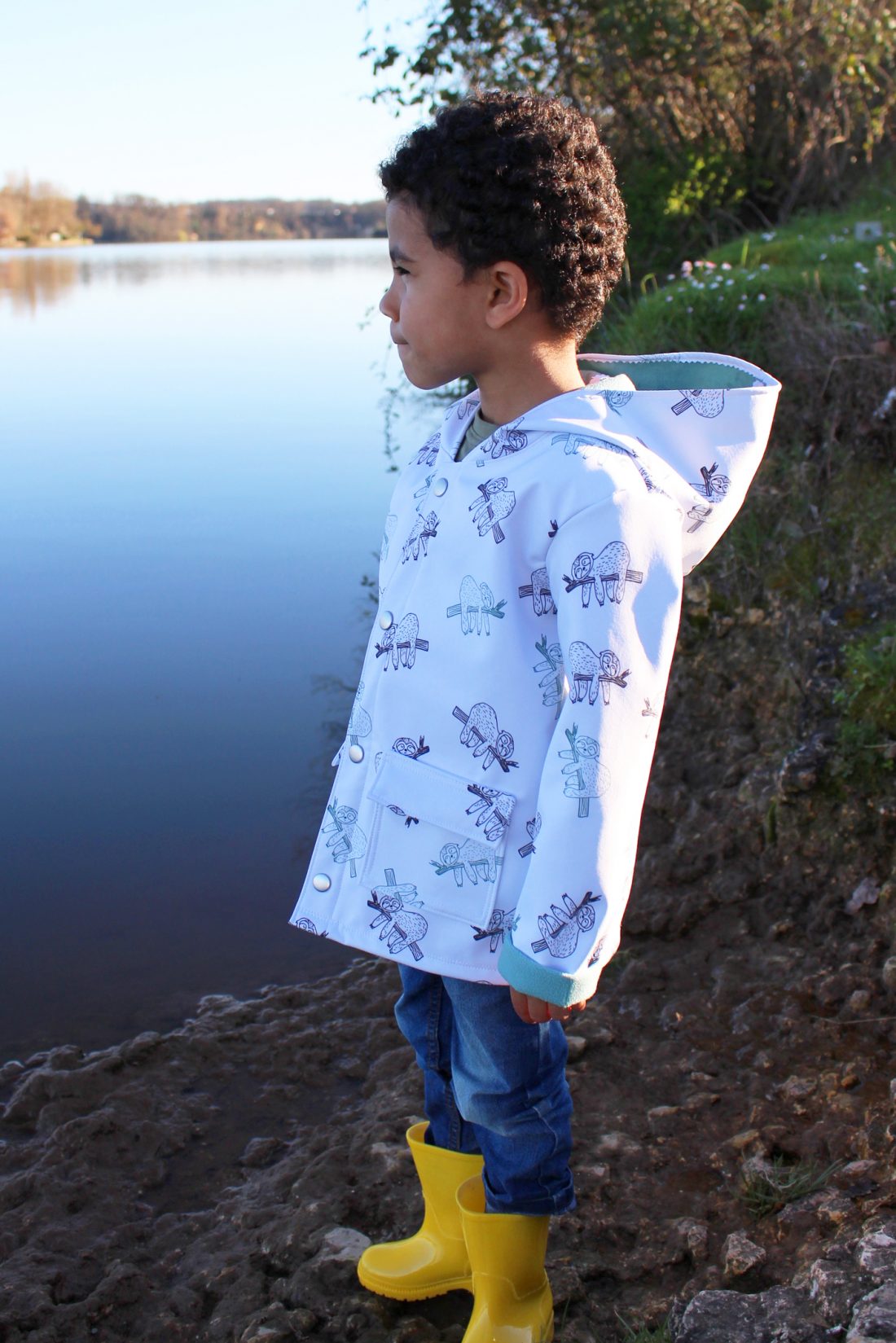 Pour la réalisation de notre imperméable enfant, nous avons choisi le patron Burda n°9334 que nous avons largement modifié selon nos envies. Réalisé en tissu softshell, le patron devient plus simple à réaliser car il ne nécessite pas de doublure. Customisez votre imper’ comme vous l’imaginez : nous avons opté pour une fermeture à l’aide de boutons pressions métalliques, mais vous pourrez tout aussi bien coudre un scratch ou réaliser une boutonnière.