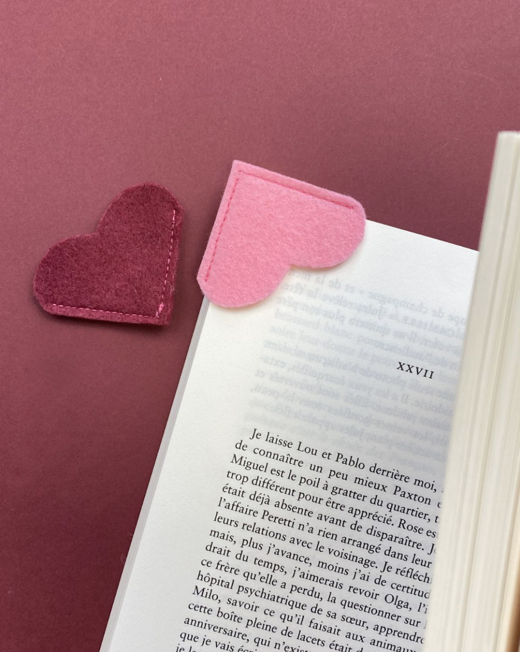 Idée-cadeau de dernière minute à réaliser à la main ou à la machine : nos mini marque-page cœur ! Ces petits marque-pages en feutrine sont faciles et rapides à réaliser et font de parfaits cadeaux pour les amateurs de livres !