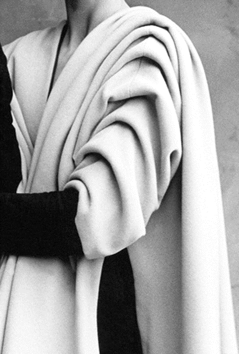 Les plissés de la taille nous viennent aussi des créations de Cristóbal Balenciaga. Le créateur qui, comme Shirley Jaffe, mélangeait les créations structurées et abstraites avec pour principal leitmotiv, l’innovation et le confort. Ce confort ultime est favorisé par le travail du plissé et le cache-coeur, que l’on retrouve au niveau de la taille de la combinaison.