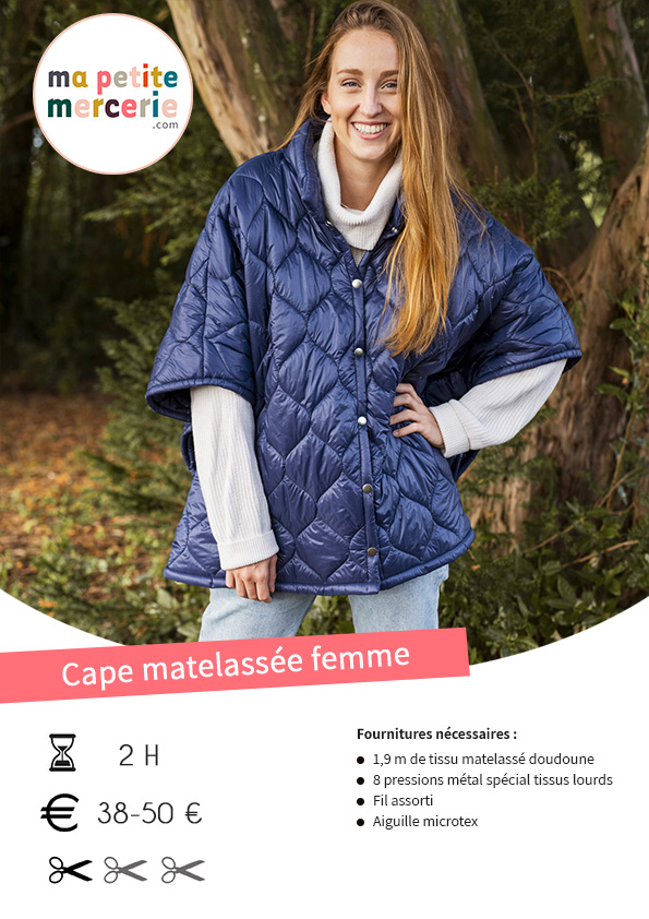Confortable et pratique, notre nouveau patron PDF gratuit de cape matelassée est parfait pour l’automne ! Facile à enfiler, cette cape oversize en tissu matelassé déperlant vous accompagnera au quotidien : pour amener les enfants à l’école, se balader au grand air ou faire ses emplettes de légumes de saison au marché !