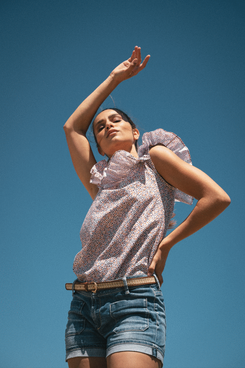 Dans les années 70, c’est notre muse de la collection qui en fait son top parfait en toutes situations. Rentré dans un jean taille haute ou un short habillé, le Haut Zénith se distingue par sa simplicité et son petit air romantique.