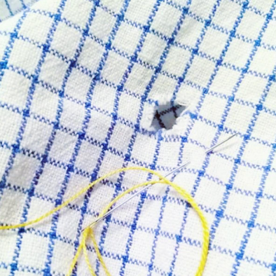 En effet, pour cela, il vous faudra encore une fois découper les fils dépassant du trou et de stopper la déchirure de l’effilochage, en réalisant un surjet à la main tout autour du trou.
