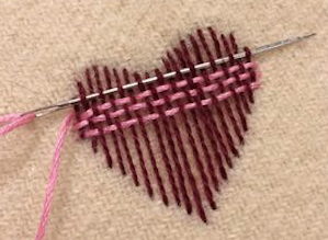 Ensuite, vous pouvez aussi combler le trou par un motif beaucoup plus simple dont le tissage renforcera votre pièce, comme ici avec un petit coeur.