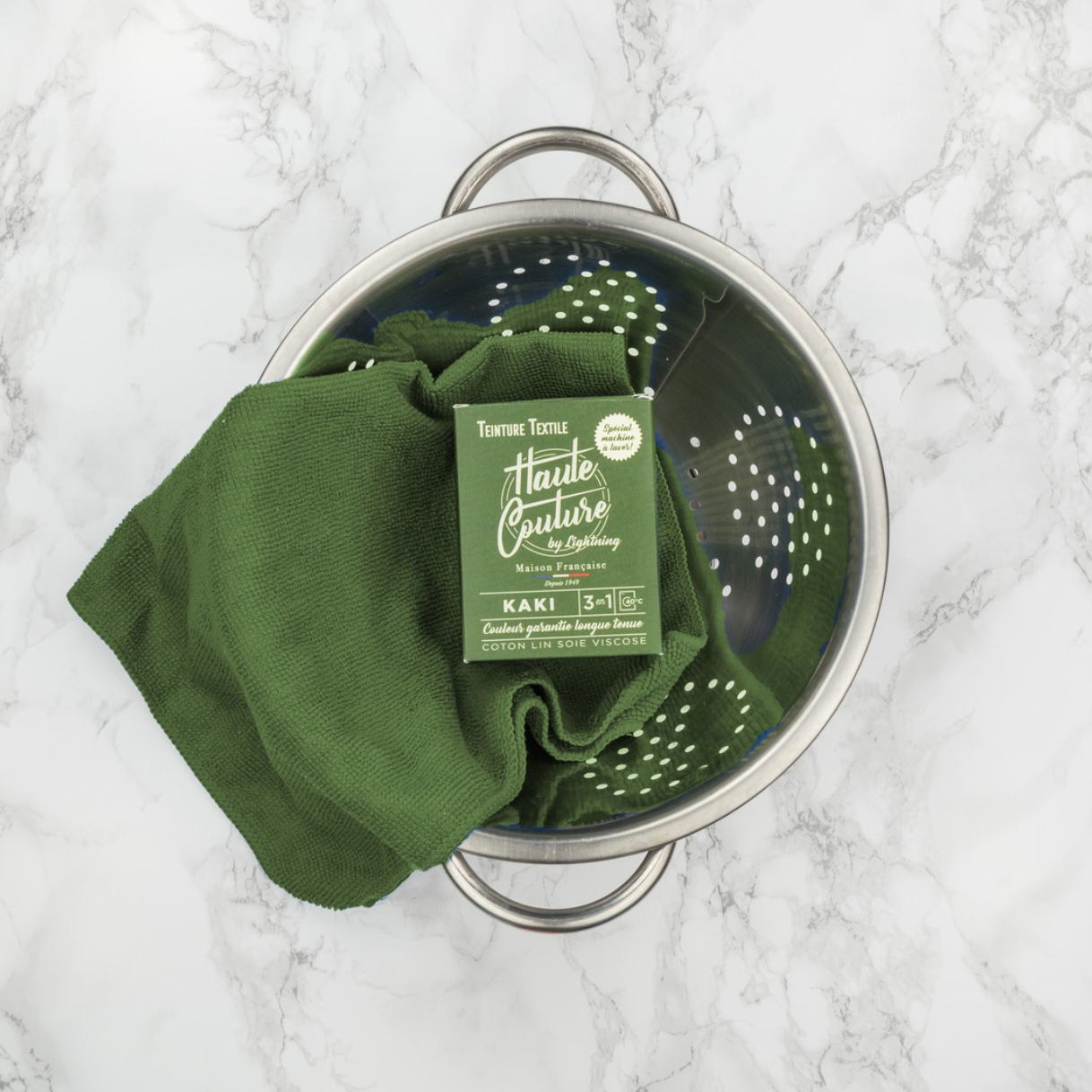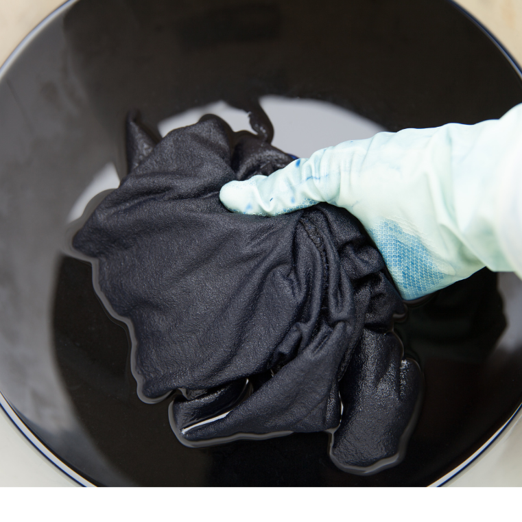 - Pour les teintures à la main : Plongez le vêtement dans la solution de teinture et remuez régulièrement pour assurer une couleur uniforme. Respectez le temps de trempage de votre teinture.