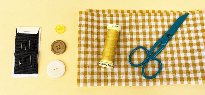 Il vous faudra bien sûr un bouton, mais aussi du fil à coudre dans une nuance proche de votre tissu et une aiguille à coudre.