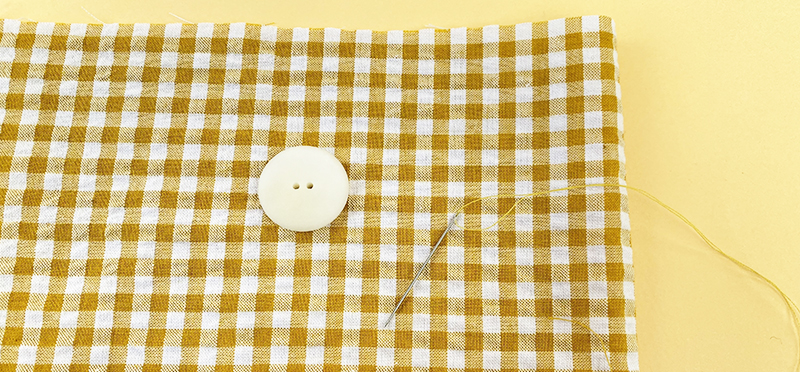 - Étape 1 : En partant du dessous, faites passer l’aiguille à travers le tissu puis dans l’un des trous du bouton et tirez le fil.