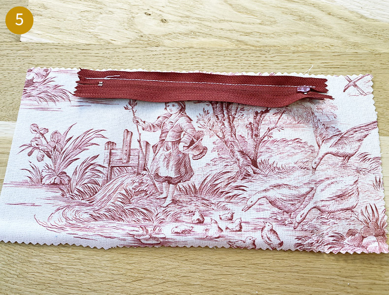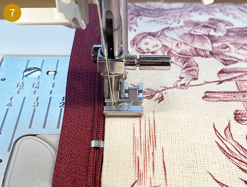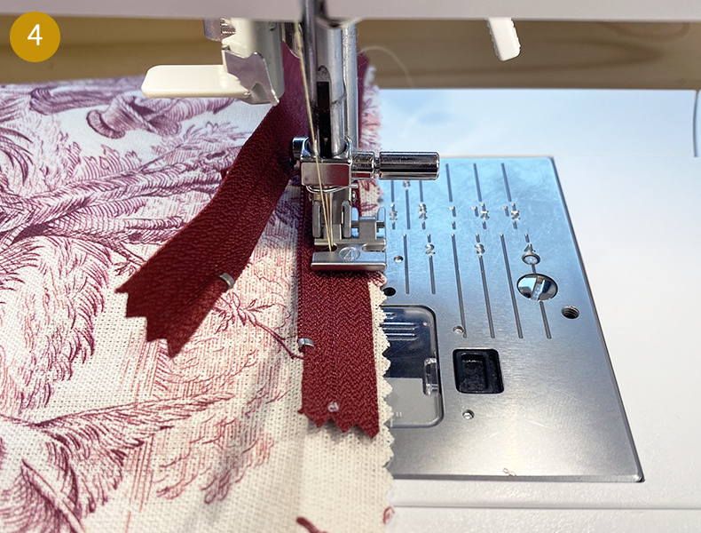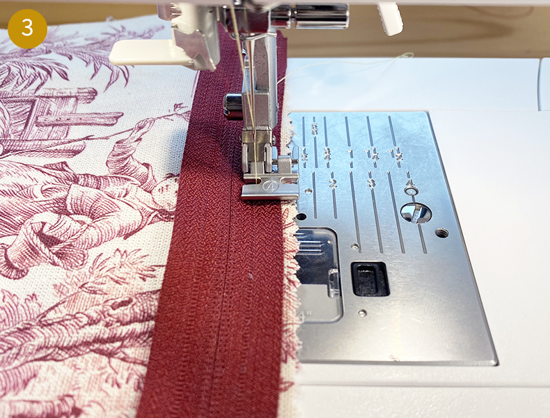 Pour cela, placez votre pied au plus proche de la fermeture en prenant soin de placer le tissu bien parallèle à fermeture et de conserver le même écartement tout du long. Au niveau du curseur, répétez l’étape 3 !