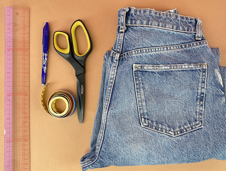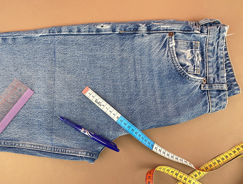 Enfilez votre jean et à l’aide d’une craie ou d’un stylo frixion, marquez l’endroit où vous voulez couper votre jean (aux genoux, au milieu des cuisses, ou en haut des cuisses) et retirez-le.