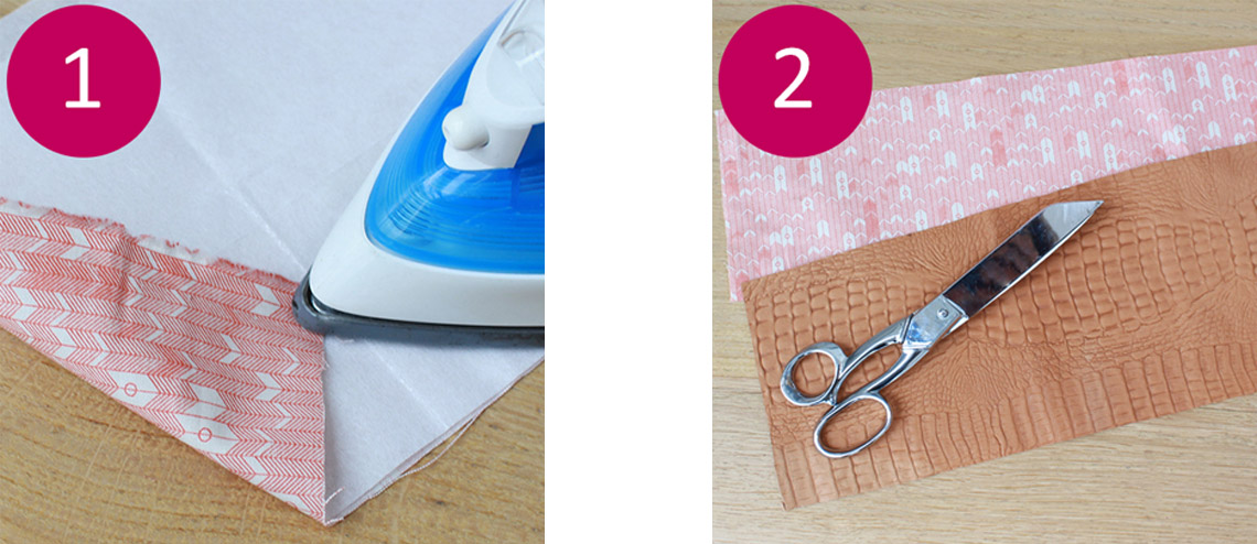 Découpez 1 rectangle de 11 x 33,5 cm dans le cuir et un rectangle de 13 x 35,5 cm dans le tissu imprimé.
