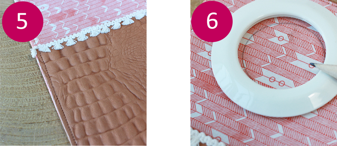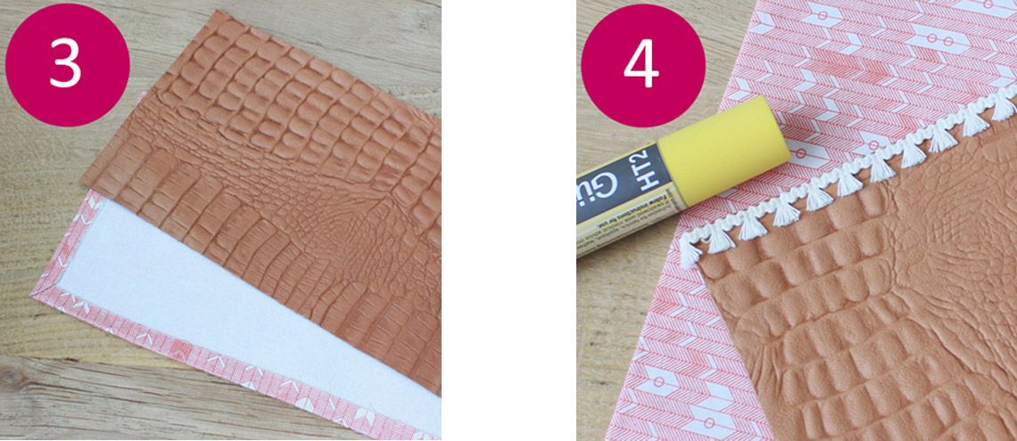 Positionnez et coller le galon sur le cuir. Collez avec la colle textile le cuir sur l’envers du coton imprimé.