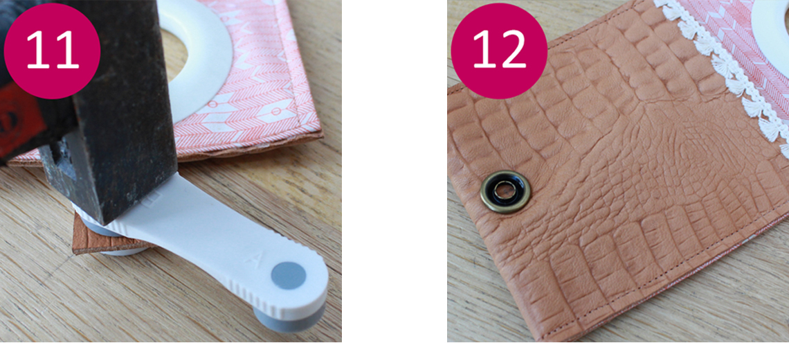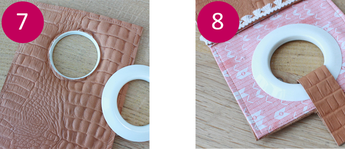 Réalisez le passant en découpant une petite bande de cuir de 2,5 cm x 13 cm. Passez la dans l ‘œillet et fixez avec un point de colle.