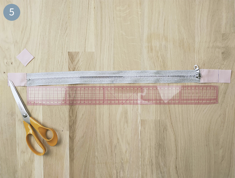Conseil : si vous préférez, vous pouvez réaliser la pose du zip en deux étapes. Cousez d’abord l’envers du zip contre l’endroit du tissu doublure puis l’endroit du tissu extérieur contre l’endroit de la fermeture.