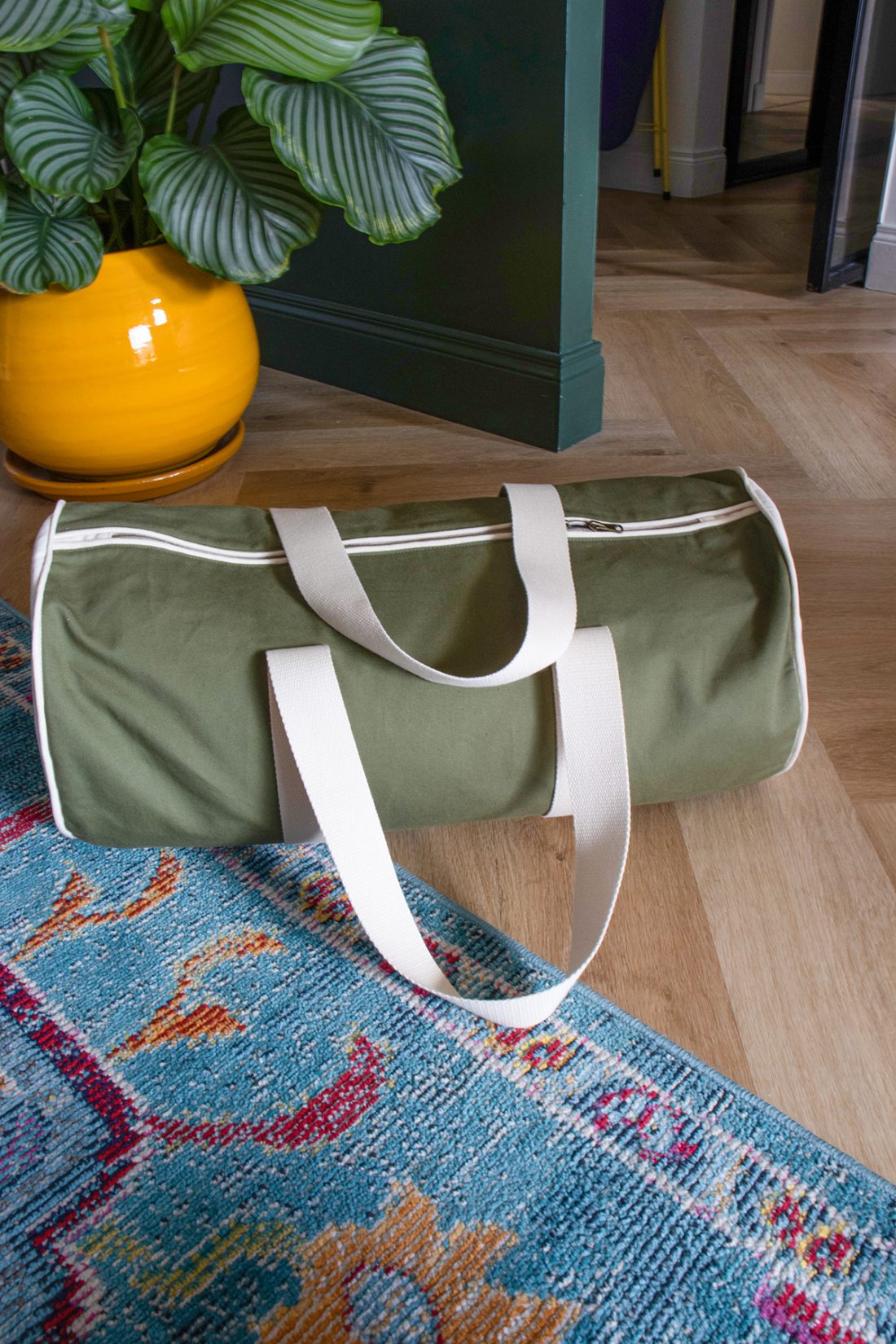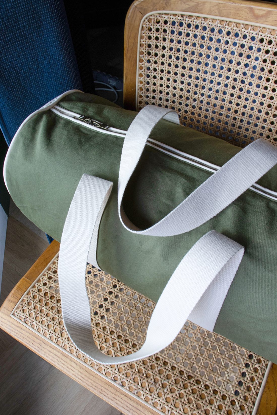 Retrouvez également le kit sac polochon prêt à coudre, disponible en kaki, bleu et marron.