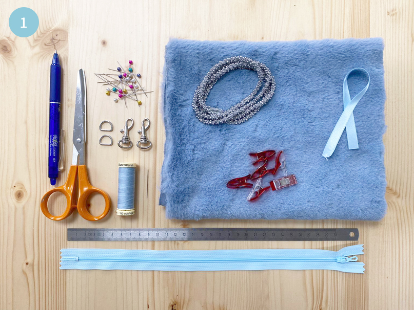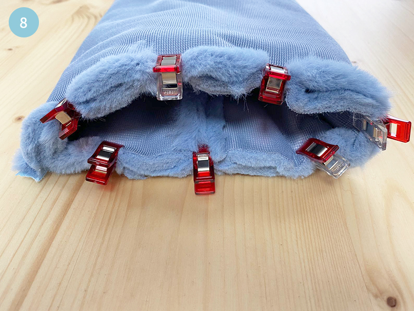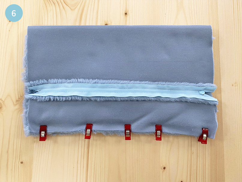 Endroit contre endroit, assemblez à l’aide des pinces le plus petit rectangle avec le zip. Celui-ci doit d’abord être fermé, tirette vers le bas. Piquez le long de la fermeture. Au niveau du curseur soulevez le pied presseur, déplacez la tirette puis terminez la piqûre.