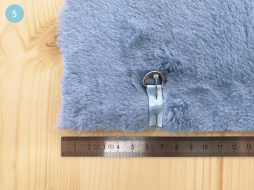Sur une des largeurs de votre pièce de doublure, de chaque côté, épinglez sur l’endroit et vers l’intérieur, à 6 cm du bord , le ruban tenant l’anneau. Piquez à 2 mm du bord pour maintenir.