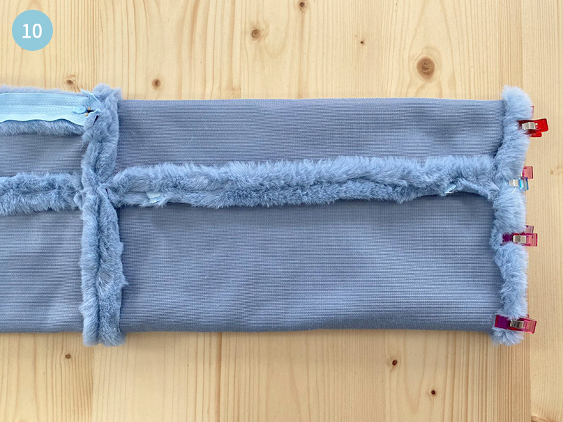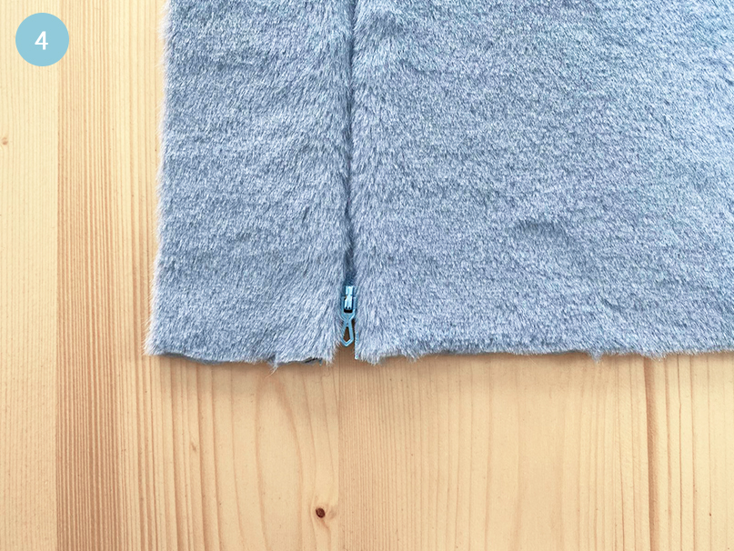 Attention, à cette étape il faut veiller à ce que les pièces de chaque côté du zip se retrouvent dans le même sens. Rien de plus simple pour le vérifier que de regarder le sens du poil.