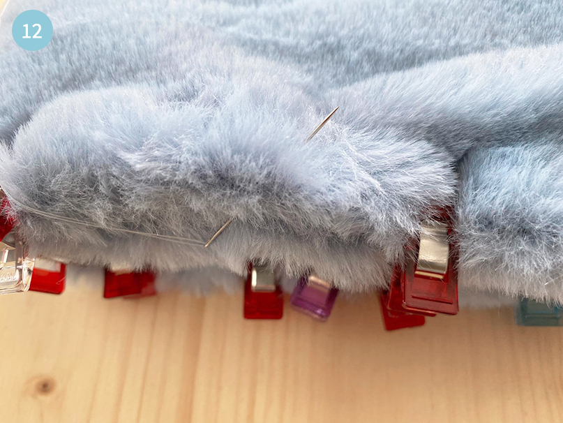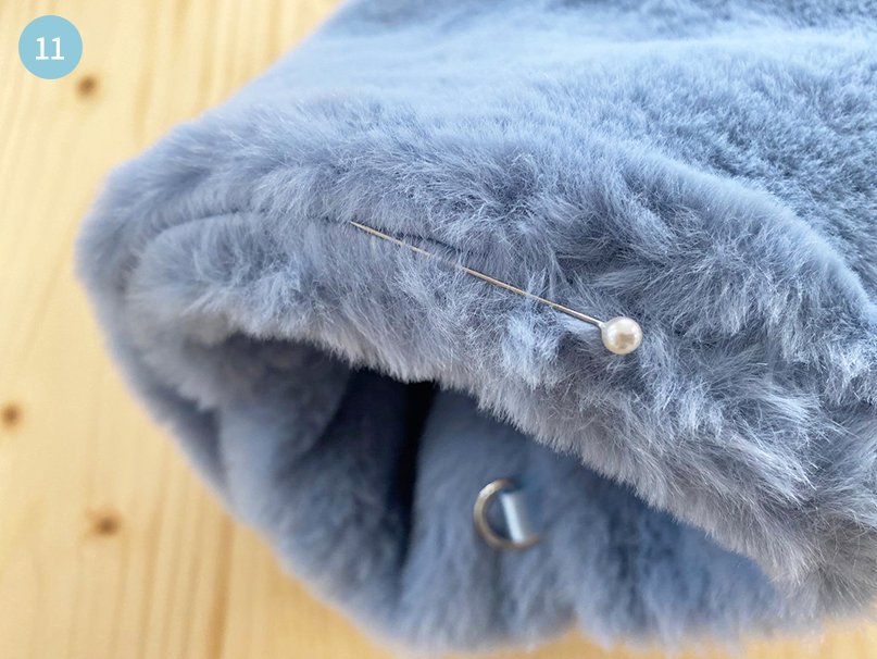 Retournez sur l’endroit la partie extérieure sur la partie doublure. A l’aide d’une épingle, faites ressortir les poils pris dans la couture.