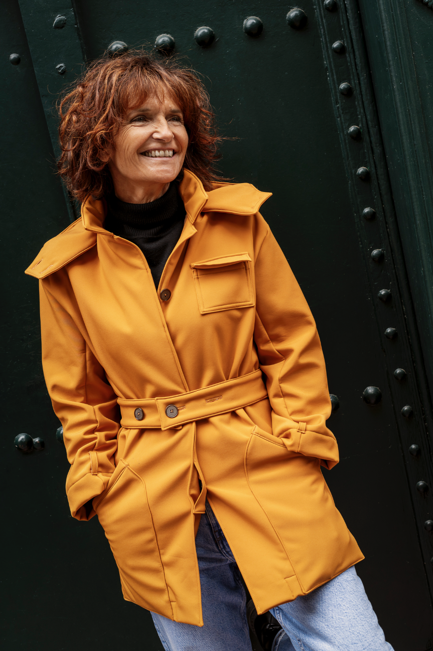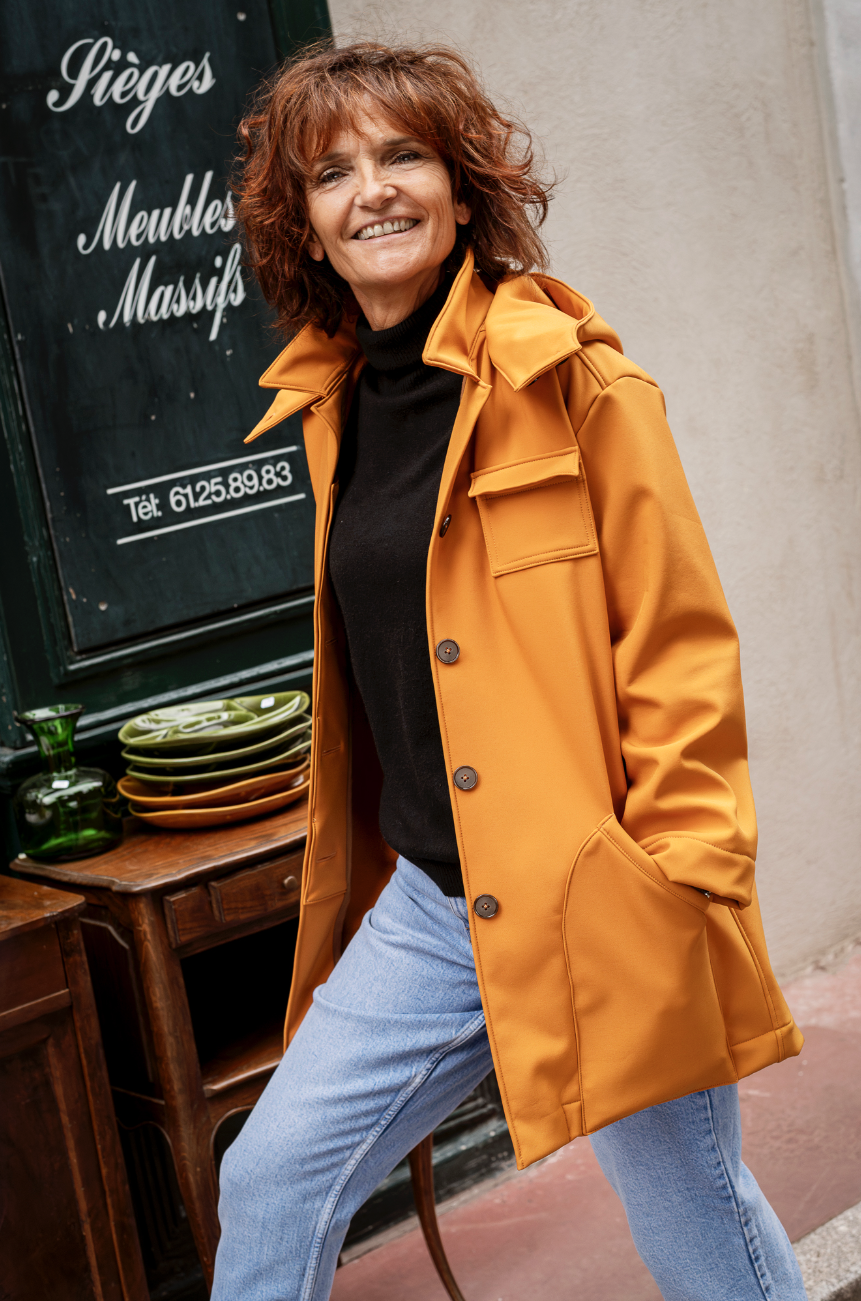Le patron Une Veste au Sahara est disponible du 34 au 56, et nous vous proposons une extension gratuite pour coudre une capuche amovible pour avoir la tête au sec ! Cette capuche s’adapte à toutes les tailles et se boutonne derrière le col de la veste.
