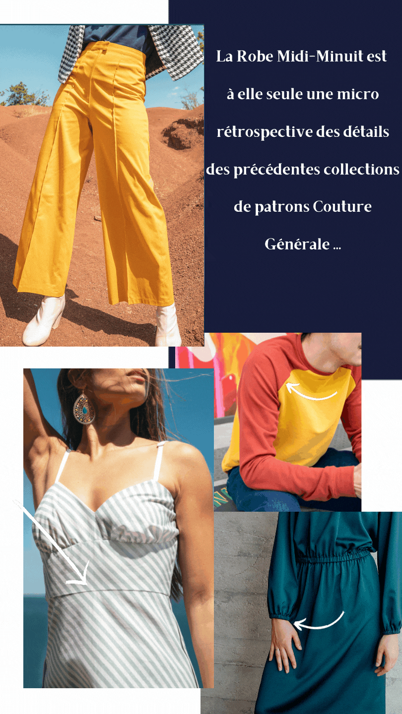 Aussi, la robe Midi-Minuit reprend les codes de manches travaillées de la robe Happy New Robe et est soulignée par une bande rapportée comme sur la Robe à l’Italienne.