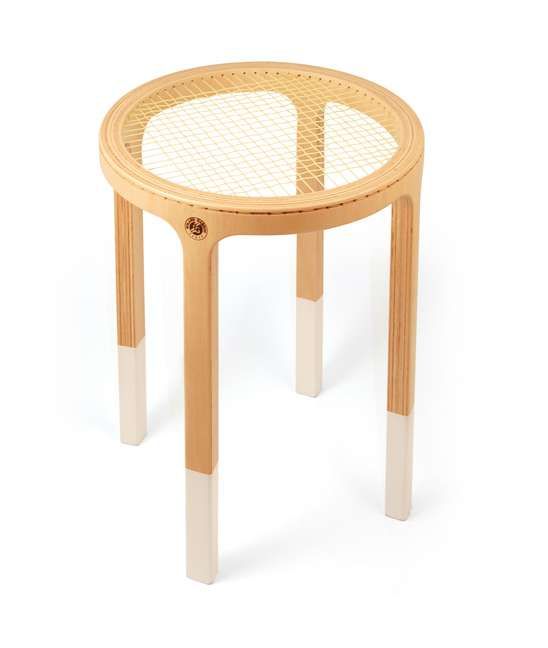 Des lignes droites que l’on retrouve sur le filet des courts de tennis, ou dans le design des raquettes d’époques transformées en tabouret par Laurent Lucas.