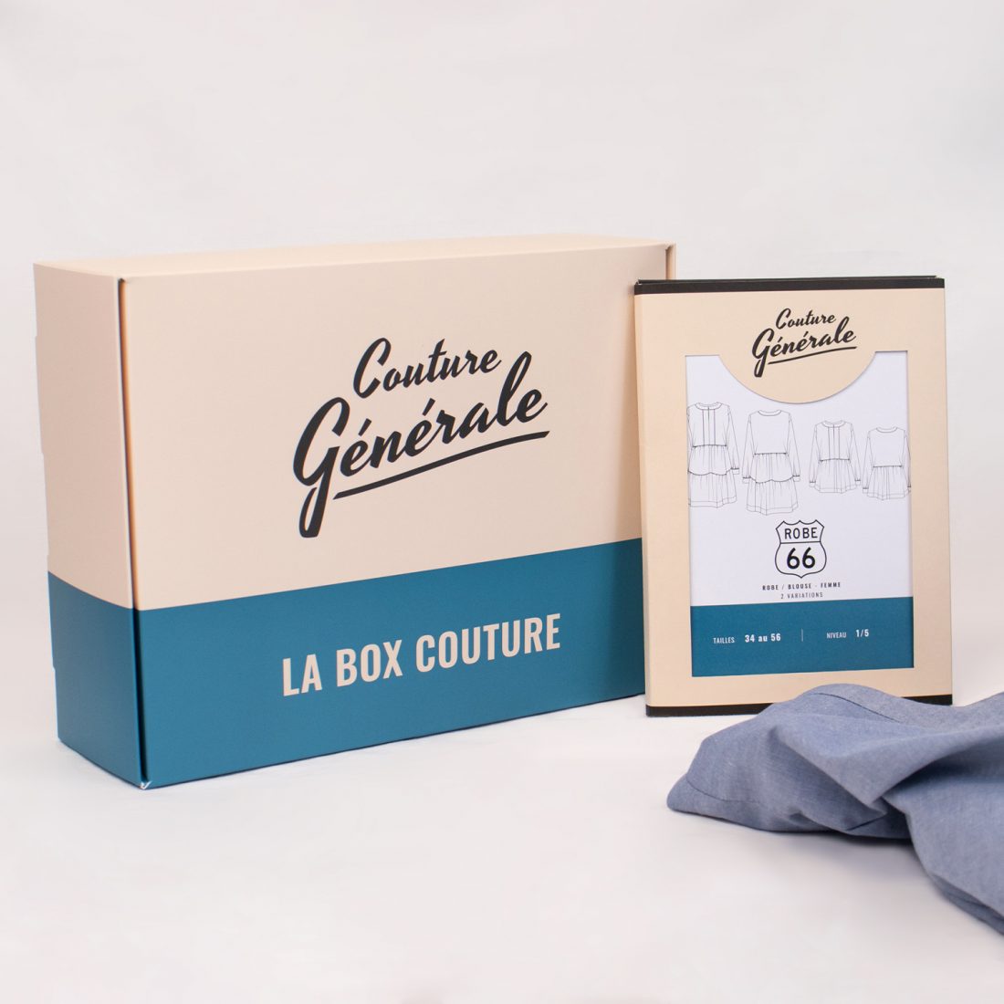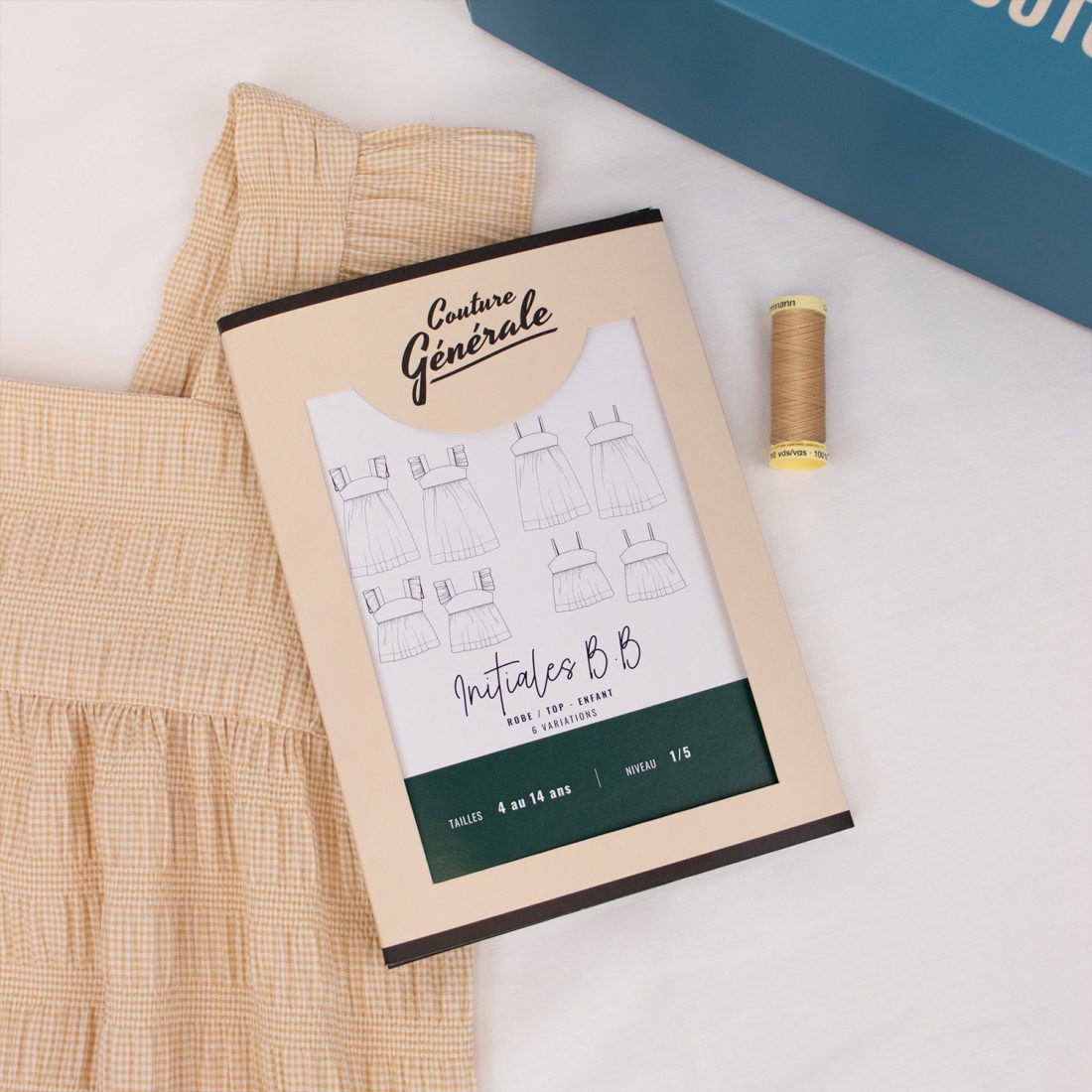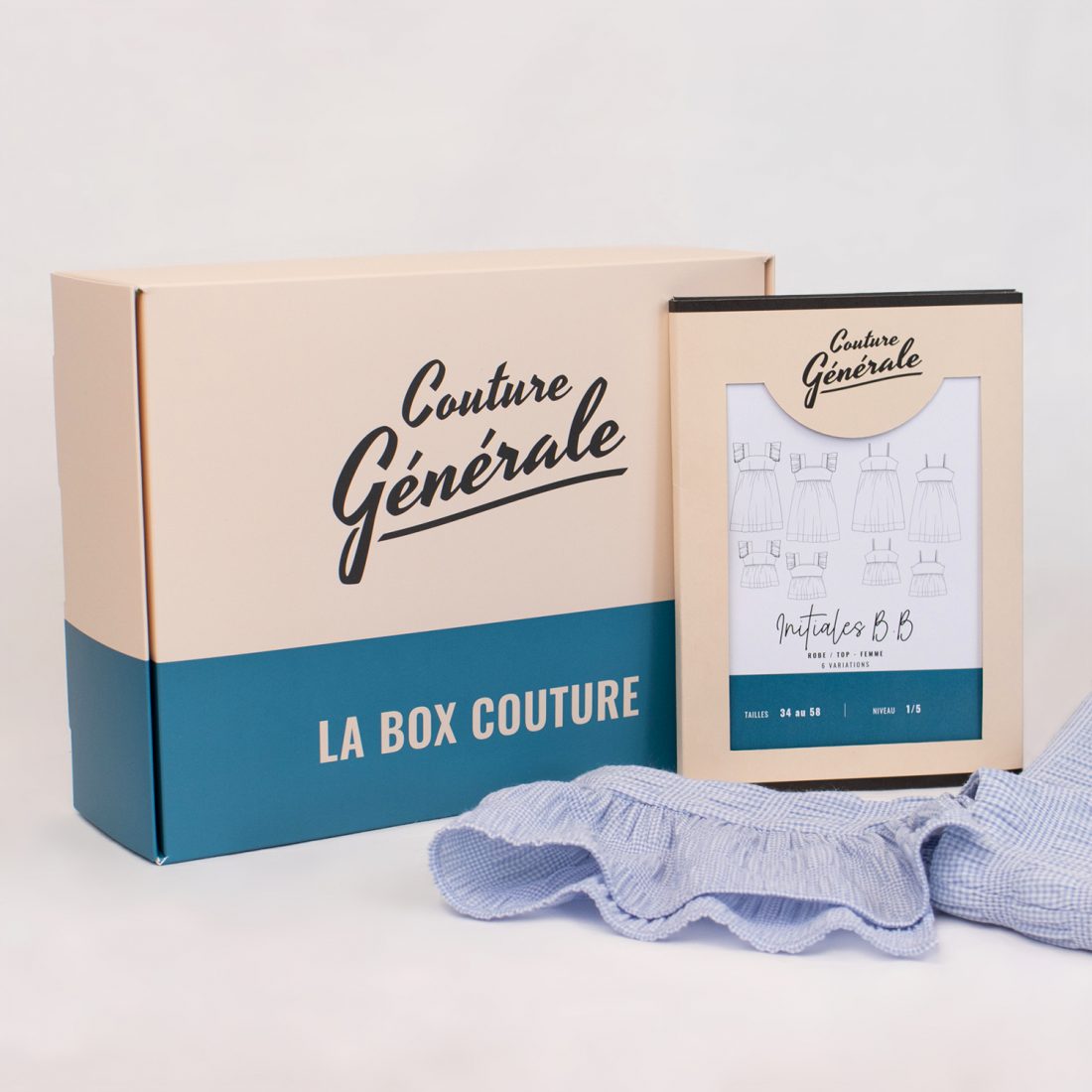 La version adulte et la version mini sont disponibles en box, à partir de 29€90. La box contient le patron de couture, du tissu seersucker bleu, sable ou noir et 1 bobine de fil.