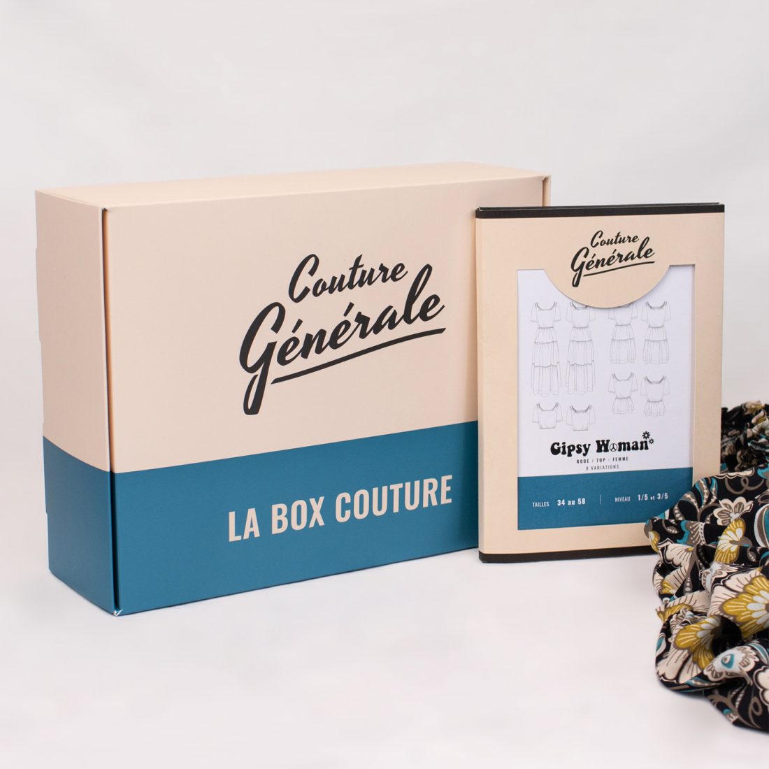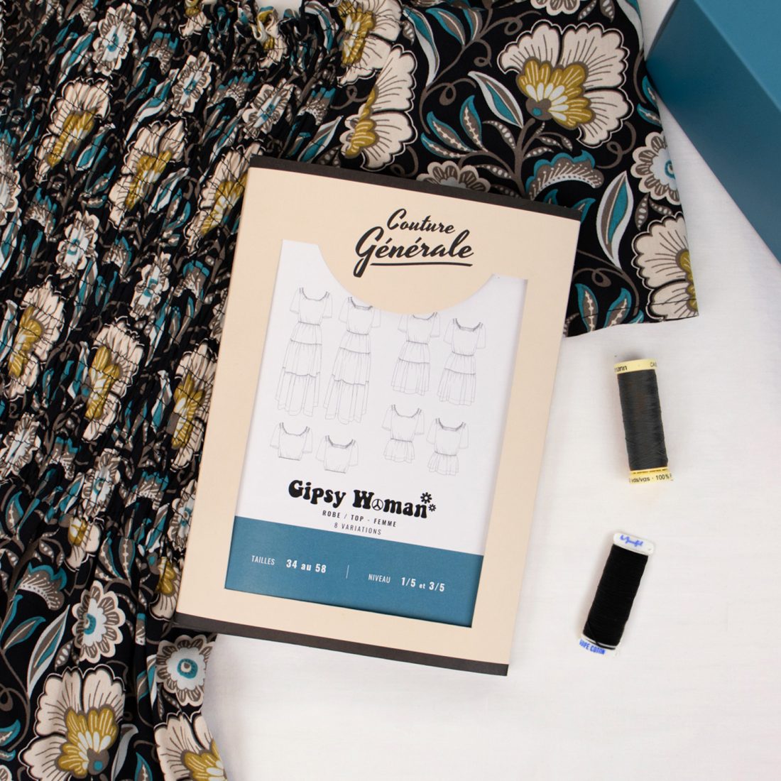En version box, elle est proposée dans un tissu viscose à motif de fleur Belle Époque. Elle contient également le patron de couture, 4 bobines de fil à froncer et 1 bobine de fil standard.