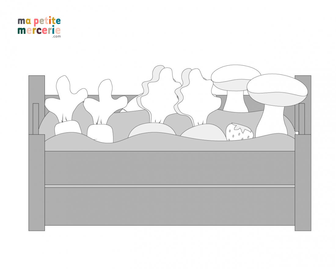 Ce jeu de potager en tissu a été réalisé entièrement en double gaze de coton et de bambou de différentes couleurs, dans ce tuto, on vous explique comment coudre chaque élément et également comment créer la « terre » à adapter selon la taille de votre cagette.