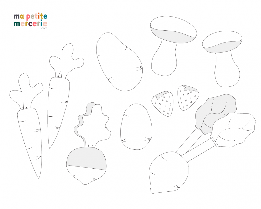 Découpez toutes vos pièces selon les gabarits fournis et multipliez par le nombre de chaque légume que vous souhaitez réaliser.