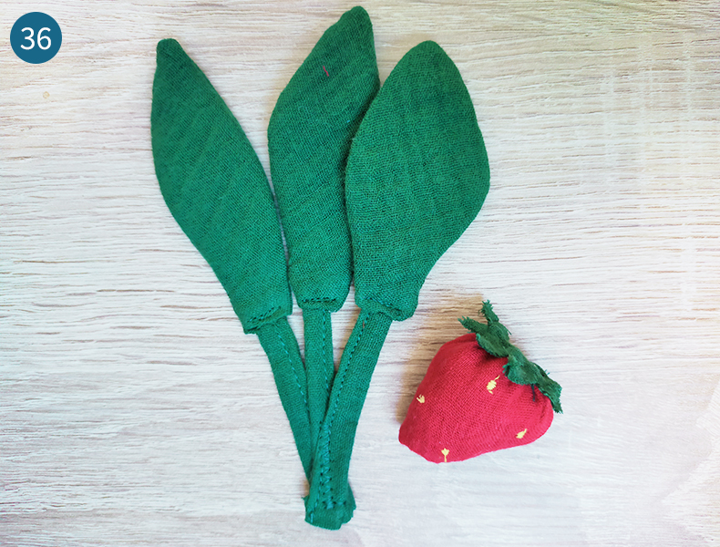 Optionnel : Si vous le souhaitez et pour plus de réalisme, vous pouvez broder à la main ou à la machine quelques points jaunes sur la partie rouge de la fraise (photo 29).