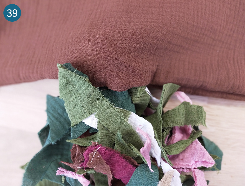 C’est le moment de rembourrer le chou ! Positionnez le cœur du chou face à vous (feuilles contre la table). Placez des chutes de tissus sur le milieu (photo 20).