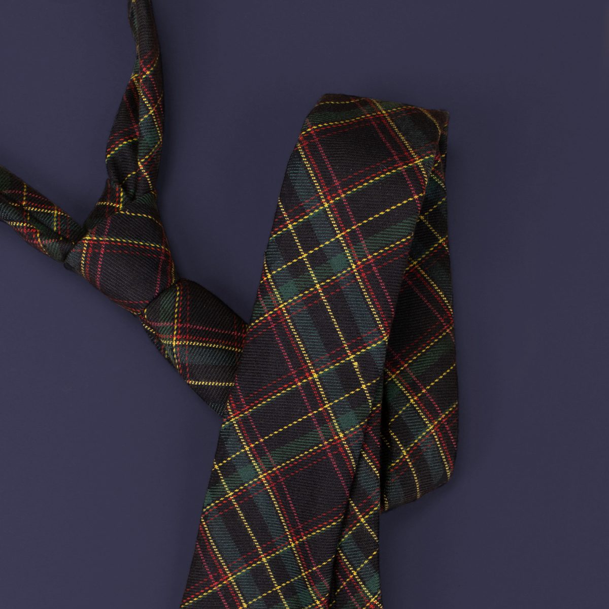 Afin que la cravate demeure bien en place, avec des points invisibles à la main, venez coudre, sur l’arrière, au niveau des pointes, les deux épaisseurs de tissus ensemble (Attention de ne pas attraper dans la couture le tartan du côté extérieur). (photo 13)