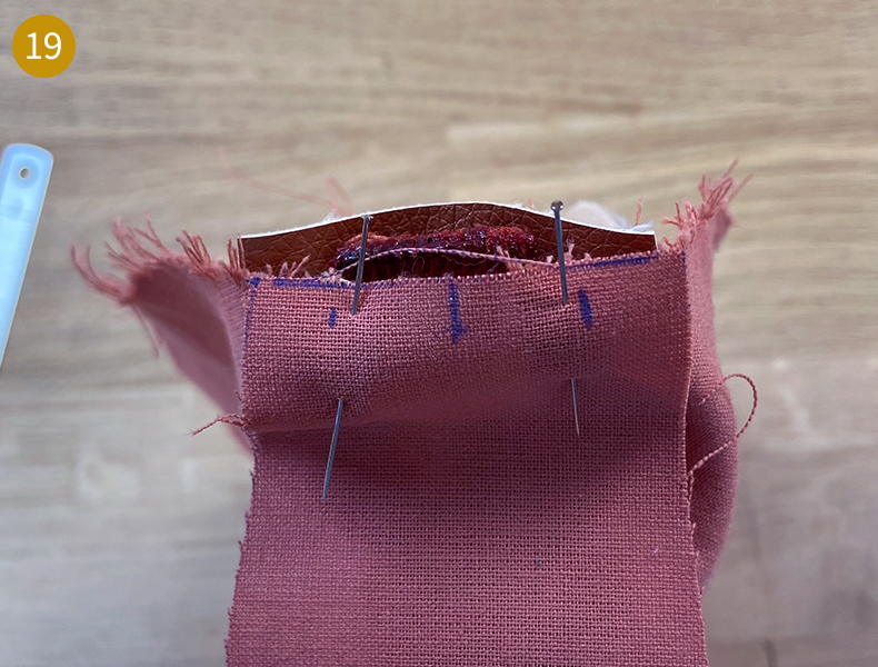 Puis, épinglez votre soufflet simili endroit contre endroit sur votre devant et dos en simili cuir (le cran de votre soufflet vient sur le bord de votre devant et dos) et piquez votre soufflet sur la couture de votre passepoil. Arrêtez-vous au même niveau que la couture de la fermeture et pensez à faire un point d’arrêt au début et à la fin de votre couture.