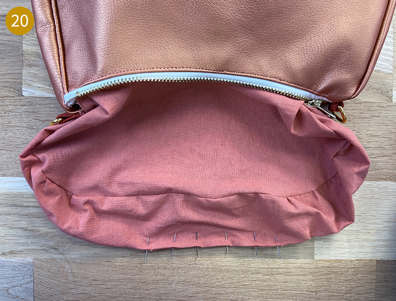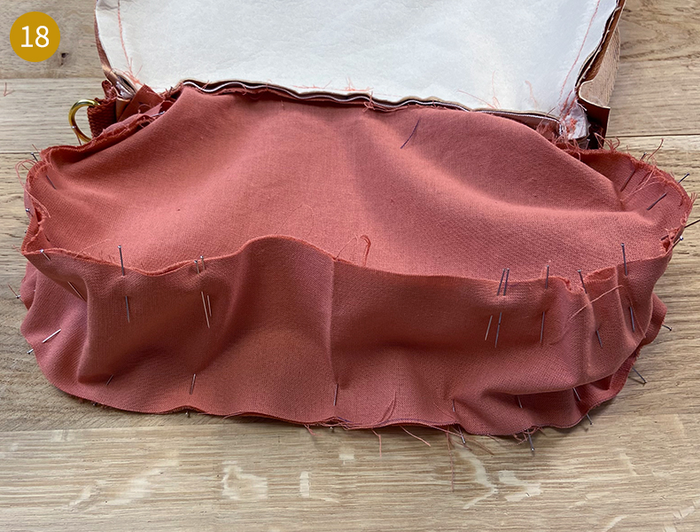 Réalisez un point main pour terminer la finition de la doublure au bord des sangles (le passage à la machine étant trop compliqué, car très épais).