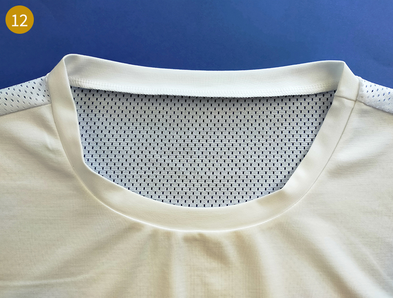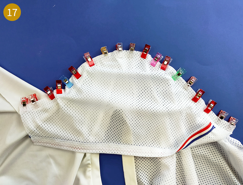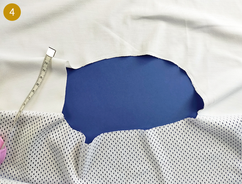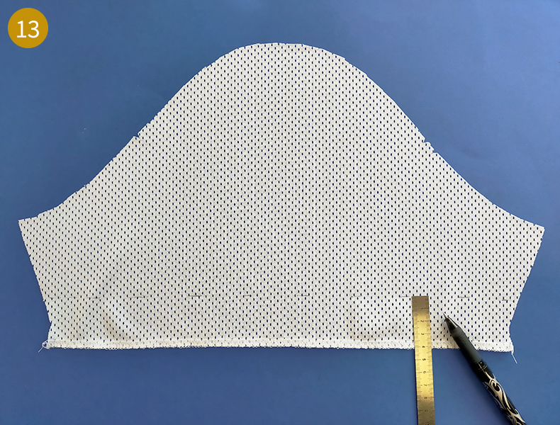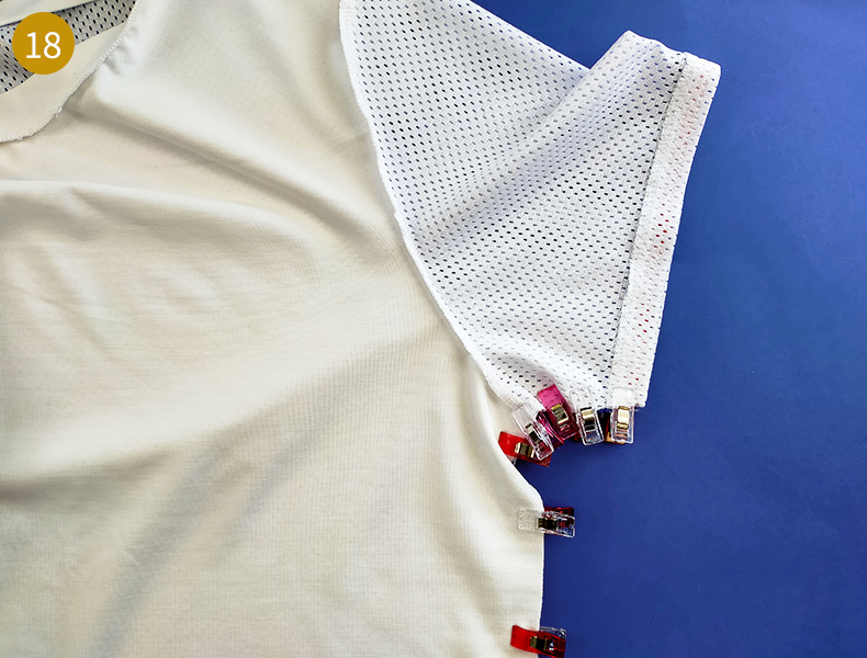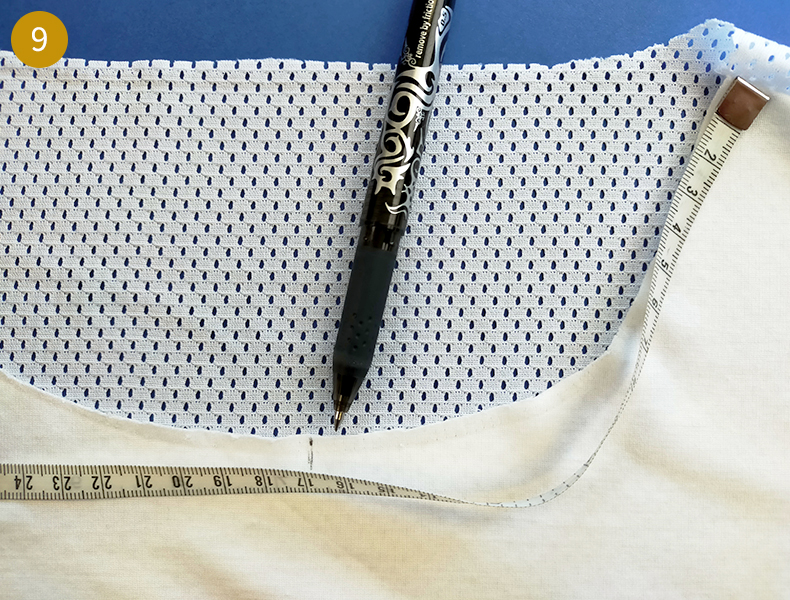 Ensuite, comme pour la bande d’encolure, marquez les milieux et les quarts de l’encolure du t-shirt. Pour ce faire, divisez votre tour d’encolure par 4 (Dans notre cas, 66 cm/4 = 16,5 cm). Mesurez à l’aide du mètre ruban et à partir de la ligne d’épaule et marquez un premier repère à cette longueur puis un second de la même longueur à partir du précédent repère et ainsi de suite.