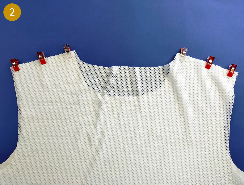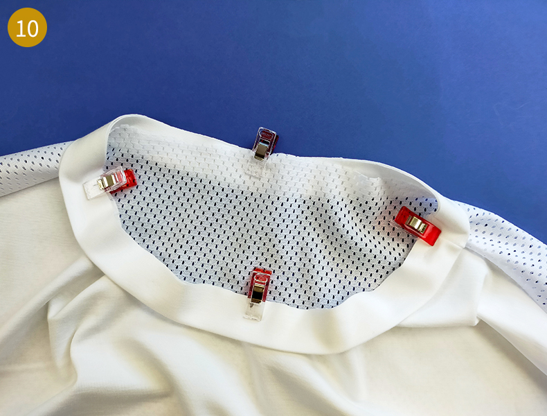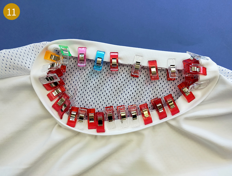Puis positionnez la bande, endroit contre endroit sur l’encolure et épinglez. Commencez en faisant d’abord correspondre la ligne de couture de la bande avec l’une des coutures épaule puis faites coïncider vos autres repères de milieux et quarts. Entre chaque repère, étirez un peu la bande pour bien la faire correspondre avec l’encolure. N’hésitez pas à utiliser beaucoup de pinces pour maintenir et ainsi éviter les plis au moment de la couture.