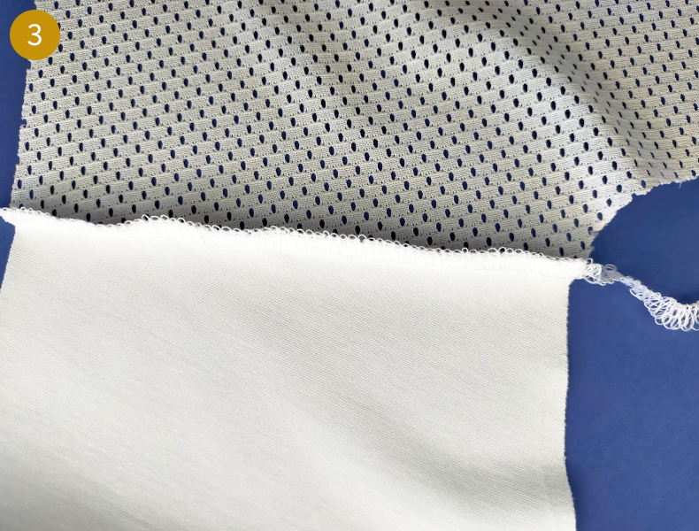 - Réalisez le montage avec une piqûre (point droit large (3), point éclair ou point extensible si votre machine en possède un) à 7 mm du bord puis faites un surjet au point zigzag (ou au point overlock) des marges de couture ensemble.