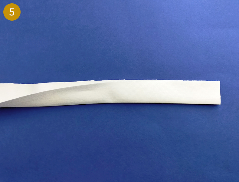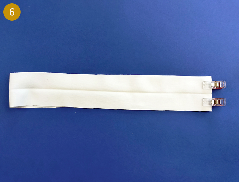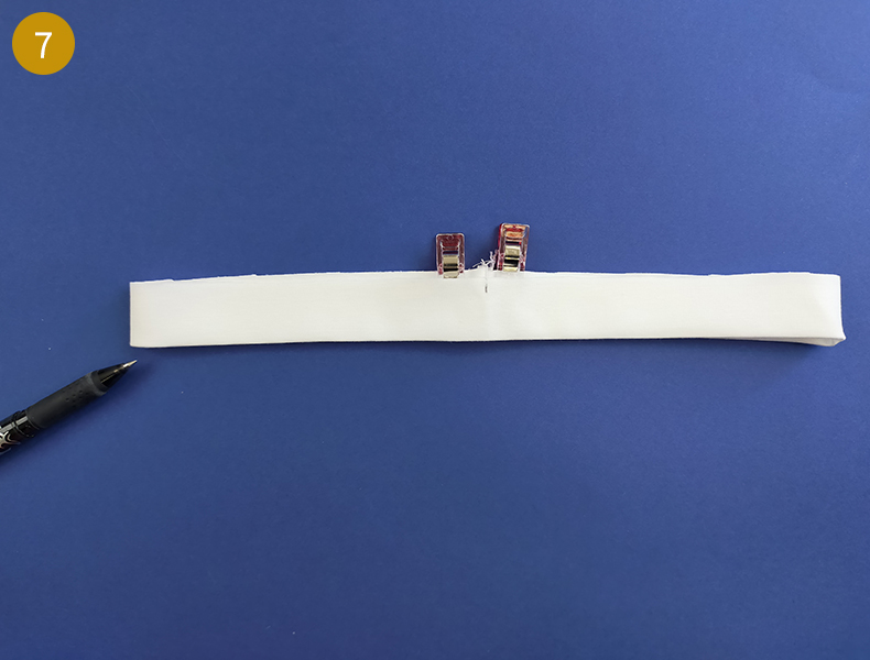 Après l’avoir découpé, pliez bord à bord, envers contre envers, dans le sens de la longueur puis marquez bien le pli au fer à repasser. Dépliez votre pièce puis assemblez endroit contre endroit par les petits côtés. Épinglez puis piquez à 7 mm.