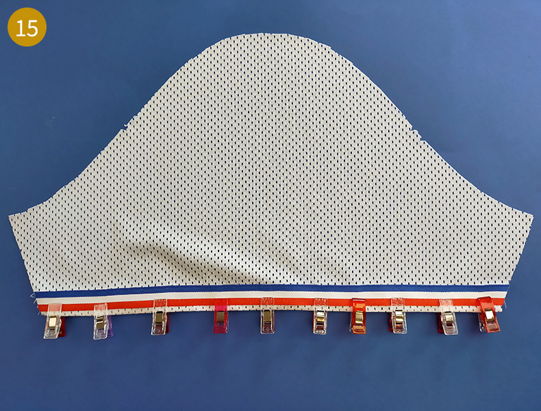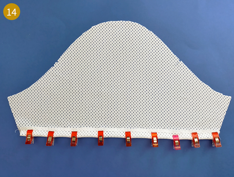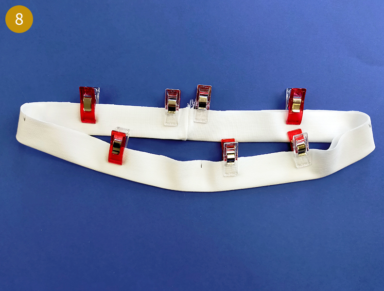 Puis, positionnez votre bande d’encolure dans sa position finale (envers contre envers) et repassez correctement. En vous aidant du repère de la ligne de couture, marquez au stylo frixion les milieux et les quarts, pour en faciliter le montage. Vous pouvez, pour maintenir la bande bien bord à bord, mettre quelques épingles mais attention de ne pas cacher vos repères.