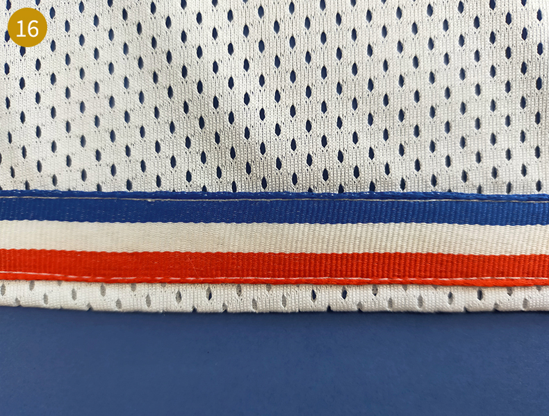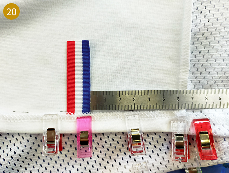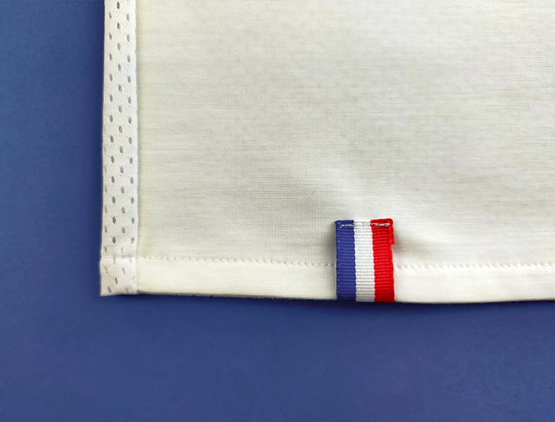 Pour les rubans Bleu-Blanc-Rouge, découpez deux rubans de la longueur de vos bas de manche. Sur l’endroit de la manche, positionnez le ruban à 0,5 mm du bord, épinglez pour maintenir. Réalisez une piqûre sur toute la longueur du bas de manche au plus près des deux bords, le rouge et le bleu. Repassez correctement le bas de vos manches.