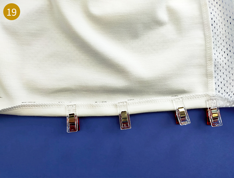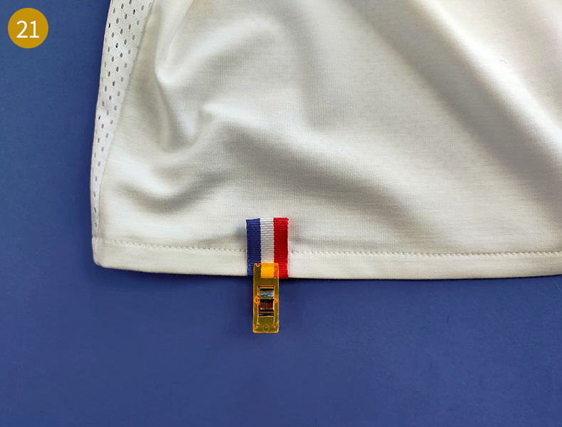 Réalisez un ourlet de 1,5 cm vers l’envers sur le bas de votre t-shirt. Vous pouvez, pour vous aider, marquer au stylo frixion des repères à 3 cm du bord sur l’envers. Sur l’envers du devant, insérez votre petit ruban dans le rentré de l’ourlet à 6 cm de la ligne de couture du côté. Il est ainsi pris en sandwich. Maintenez-le à l’aide d’une pince et continuez d’épingler tout autour.