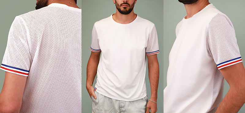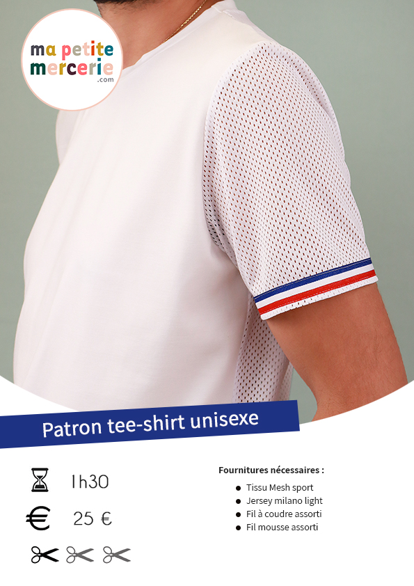 Couturières et couturiers, débutant ou confirmé, adoptez notre patron de tee-shirt femme et homme pour les tailles XS à XXL à coudre en tissu jersey ou en tissus sport. On vous propose même une version sport respirante avec un dos en tissu mesh sport ajouré avec des détails Bleu Blanc Rouge !