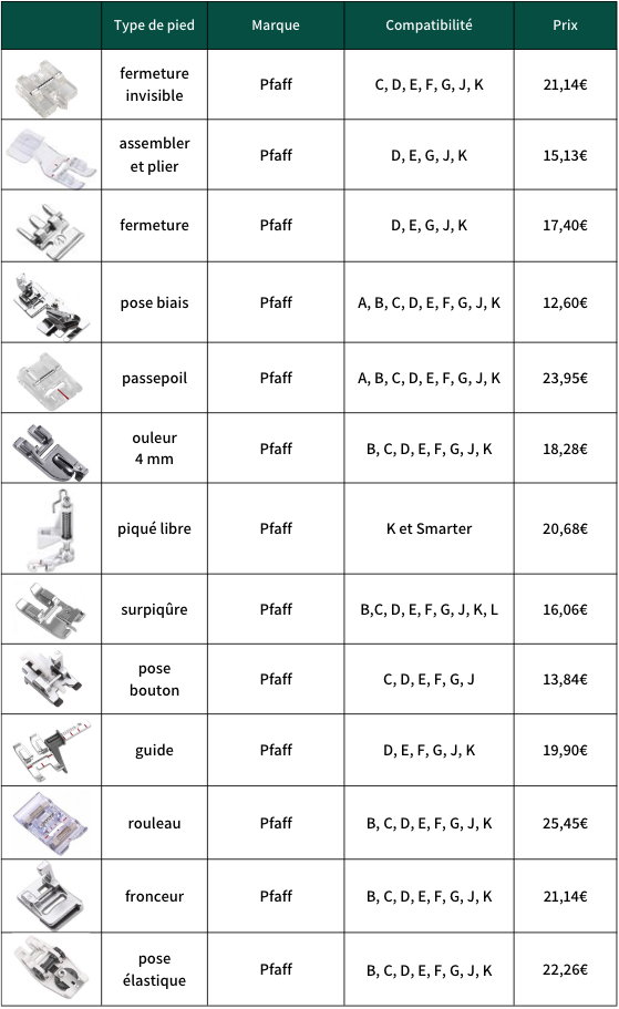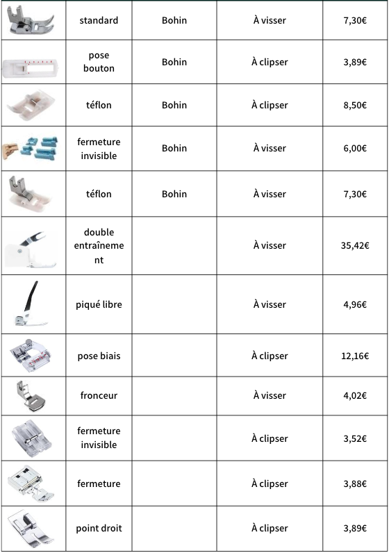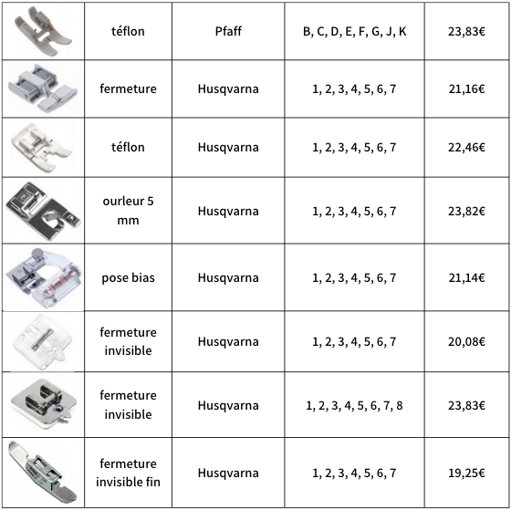 Bonjour pour le moment notre article vous présente les pieds pour machine à coudre que nous proposons sur la boutique : les marques de mercerie générique telles que Bohin ou Couture loisirs, et les marques Pfaff et Husqvarna Viking. Nous prenons bonne note de votre commentaire pour améliorer prochainement notre article sur les pieds machine à coudre. Bonne journée,