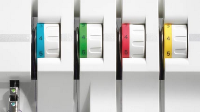 Bravo, vos 4 fils sont enfilés. Positionnez une chute de tissu, bord contre le bord de la machine surjeteuse et piquez. Réglez la tension pour obtenir l’effet souhaité.