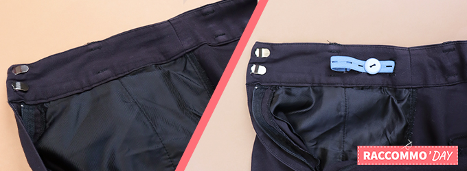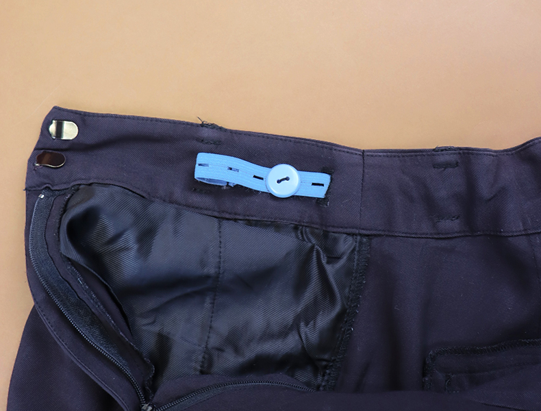 Votre ceinture élastique ajustable est terminée, il ne vous reste plus qu’à attacher l’élastique aux boutons pour ajuster votre pantalon.