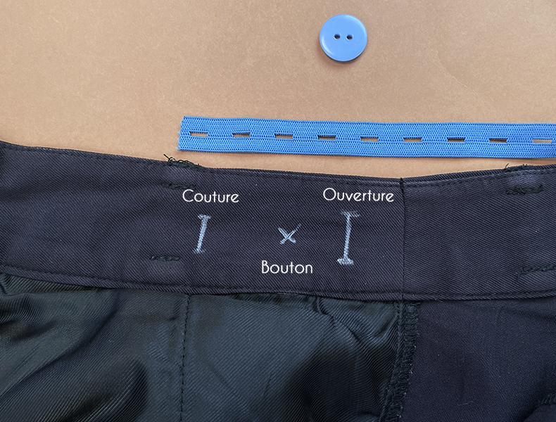 • Estimer la longueur d’élastique boutonnière nécessaire en mesurant la longueur entre les 2 coutures côté du pantalon.