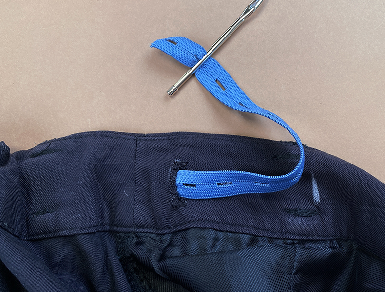 Pour terminer, il est temps maintenant d’insérer l’élastique boutonnière dans la ceinture de votre pantalon. Pour réaliser cette action, aidez-vous avec une épingle de nourrice ou un passe-lacet pour faire coulisser l’élastique dans la ceinture du pantalon.