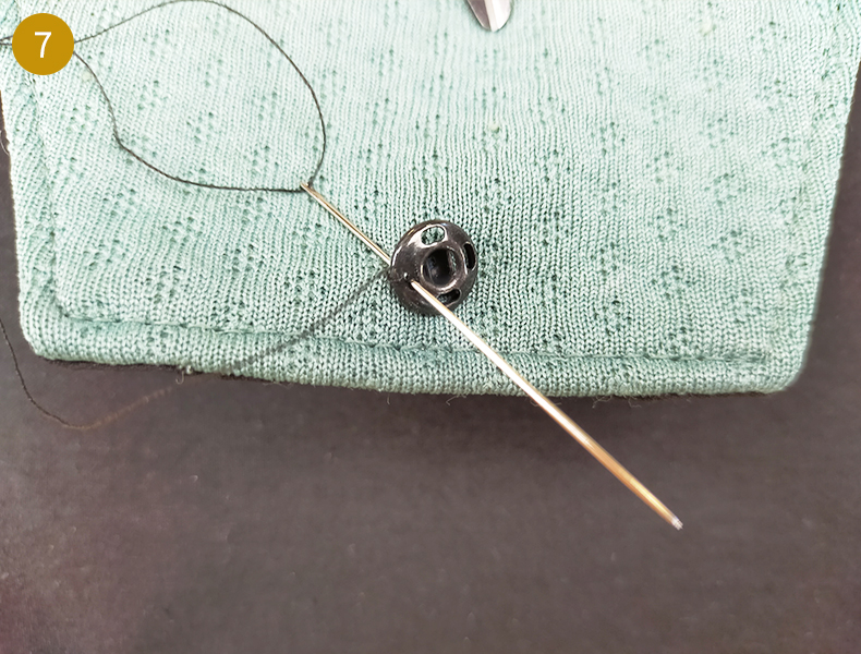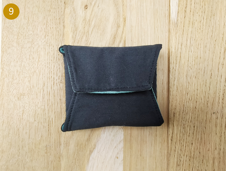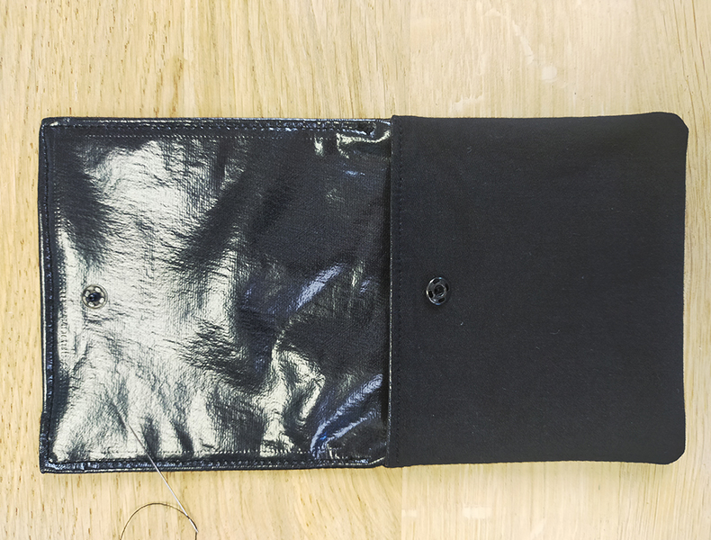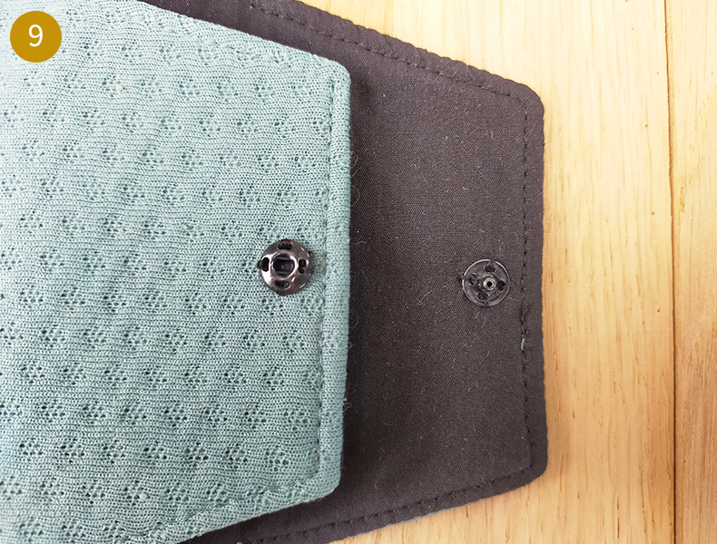 Cousez vos pressions avec du fil et une aiguille à l’emplacement prévu sur le gabarit. La partie mâle se place sur le rabat intérieur (PUL) et la partie femelle sur haut de la partie rangement. Et voilà votre pochette terminée !