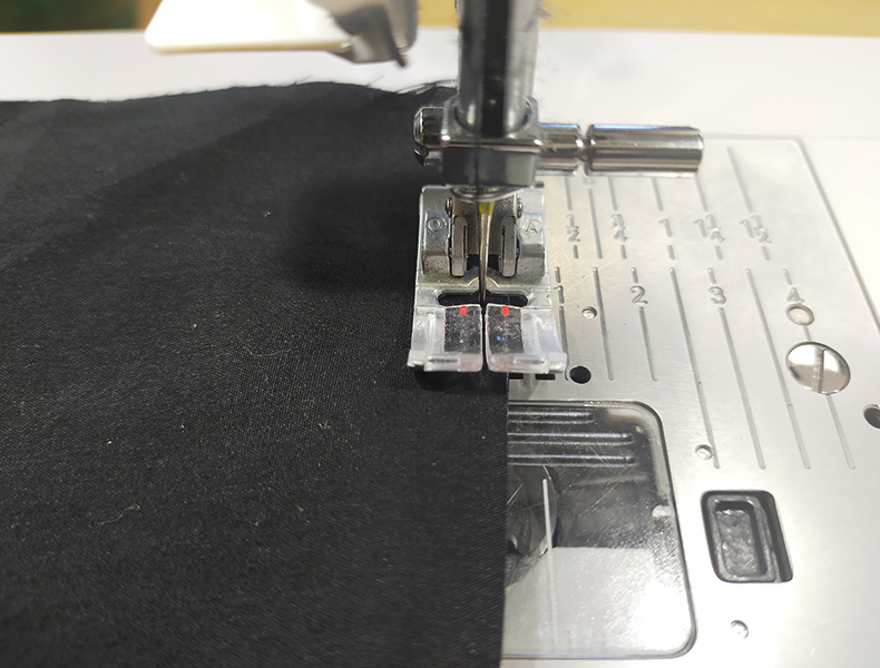 Piquez à 1 cm du bord. Commencez et terminez la couture au niveau des extrémités de l’ouverture par un point d’arrêt.