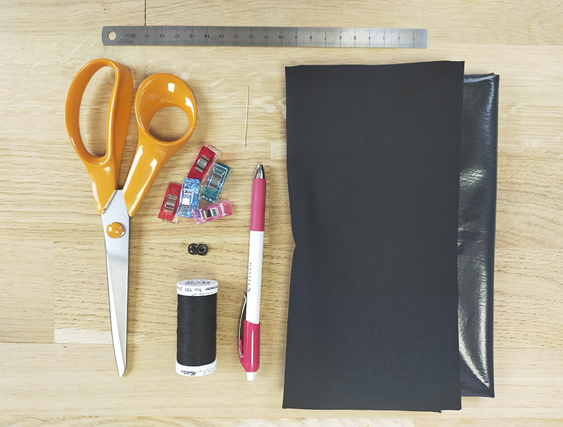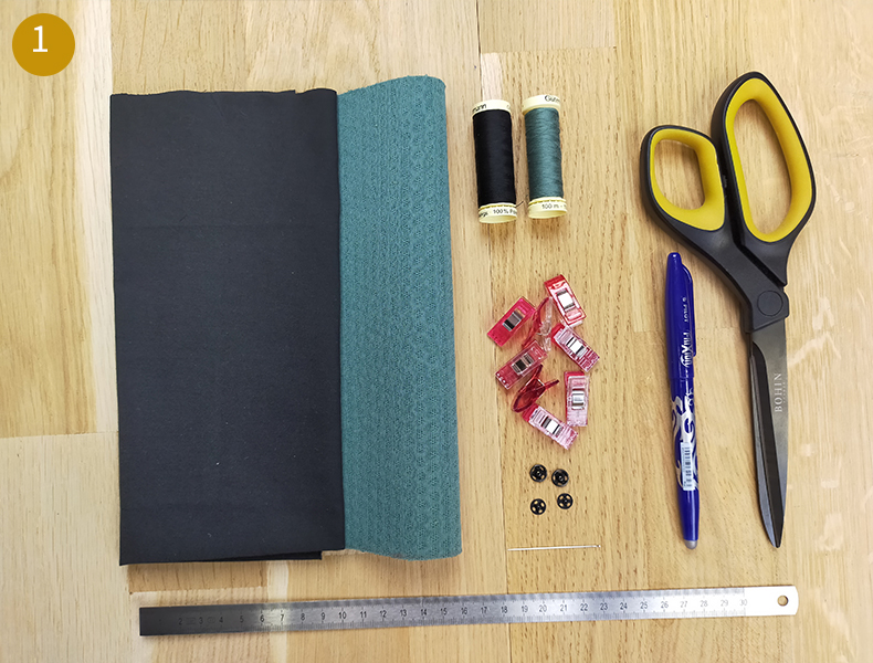 Pour ce modèle, nous avons utilisé le Zorb 4D super-absorbant staydry antimicrobien, réf.114958 et la popeline de coton noire, réf. 111816, des pressions jersey et des pressions à coudre noire .