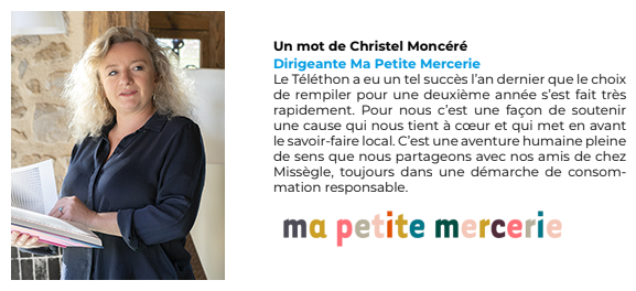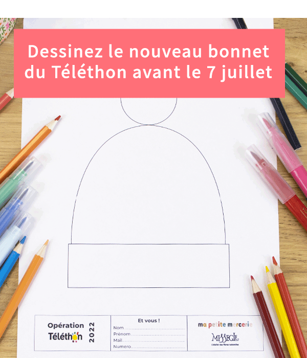 À partir du 11 juillet, rendez-vous sur les réseaux sociaux de Ma Petite Mercerie et de Missegle pour choisir le bonnet que nous vendrons ensuite au profit du Téléthon. … Avec une belle surprise pour le designer du bonnet gagnant !